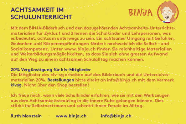 Das BINJA-Achtsamkeitstraining unterstützt die SuS in ihrem Prozess, die bewusste Verbindung zu sich, ihren Gefühlen und ihren Fähigkeiten wiederherzustellen. Das Bilderbuch «BINJA – achtsame Reise durch die Welt der Gefühle» holt die Schulkinder in ihren emotionalen Befindlichkeiten ab. Dies ermöglicht in der Klasse einen lebendigen Austausch über erlebte Situationen, die Gefühle wie Stress, Angst, Ohnmacht etc. ausgelöst haben.
